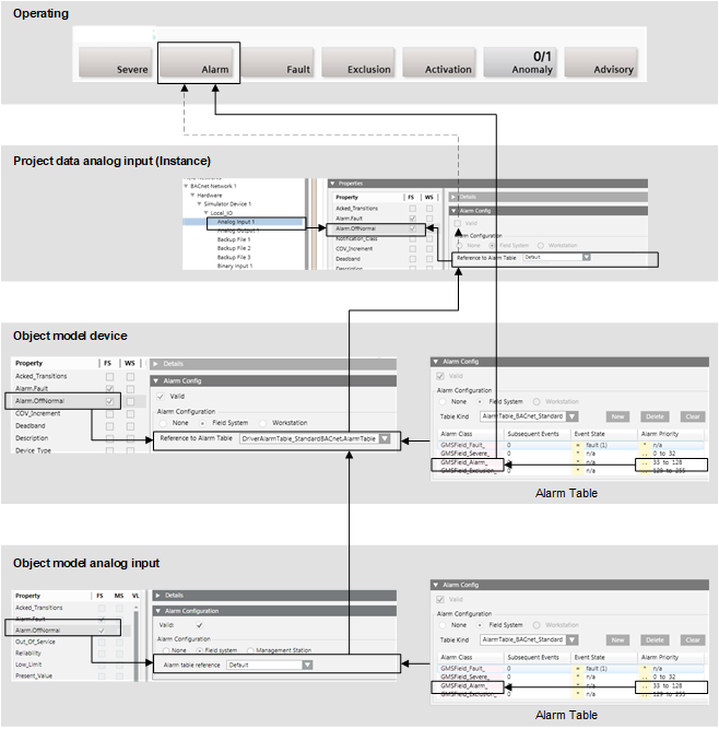 If third-party BACnet devices are integrated in Desigo CC, the alarm table must be checked in accordance with the alarm priorities of the applicable vendor or adapted where applicable. The changes are made per device (recommended) or data point.