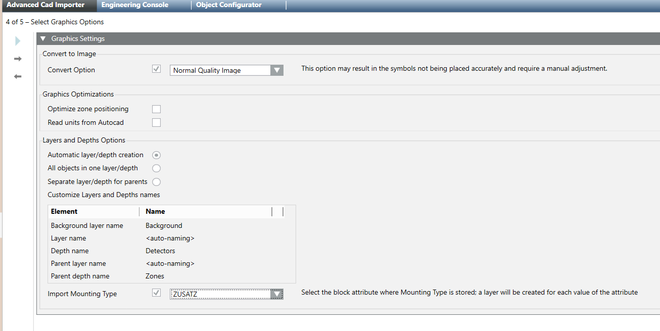 Select Automatic layer/depth creation to create a single depth including layers for each CAD object type and subtype. A second depth is created for parent objects that are not present in the CAD drawing, also separated in type/subtype layers. If parent and child objects are both present in the CAD drawing, they are imported in the first depth, and then the grandparent objects are added separately in the second depth. The table that appears below displays the resulting layers and depths Name, which you cannot customize. Note that layer names will be given from the object types/subtypes (<auto-naming>).