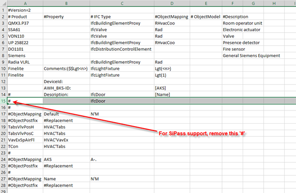 - Only the columns #Product, #Property and #IFC Type are relevant for defining room equipment. The columns #ObjectMapping, #Objectmodel and #Description are not used for this step.